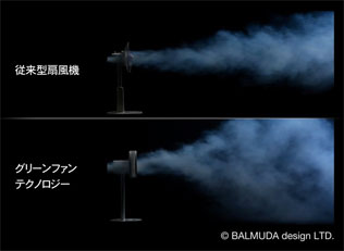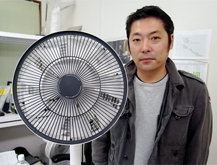 そう考えていったときに、今の「グリーンファン・テクノロジー」という2重構造の羽が構想として生まれまして、あの羽は、内側と外側に羽を分けてるんですよね。 内側から出る風のスピードに対して外側から出る風が倍になるように設定してあるんですね。 内側からは少しの風、外側からは大量に送りだされるわけです。 外側の大量の空気は内側に引き込まれるんです。