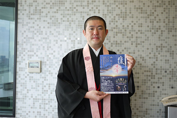 3月11日の「東日本大震災復興への祈り 復幸 〜お大師さまとともに〜」では、若手僧侶が東京国際フォーラムにて法要とコンサートを行います。また、サックスプレイヤーの渡辺貞夫さんや太鼓奏者の林英哲さんと共演し、お経・サックス・太鼓のコラボレーションを舞台で披露します。また、チケット代の一部を義援金として福島・宮城・岩手の被災三県にお渡しします。