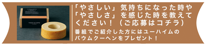「やさしいSTORY」皆さんから寄せられた優しさの物語をご紹介します。小林麗菜によるバウムクーヘン博覧会からのレポートも中継します。