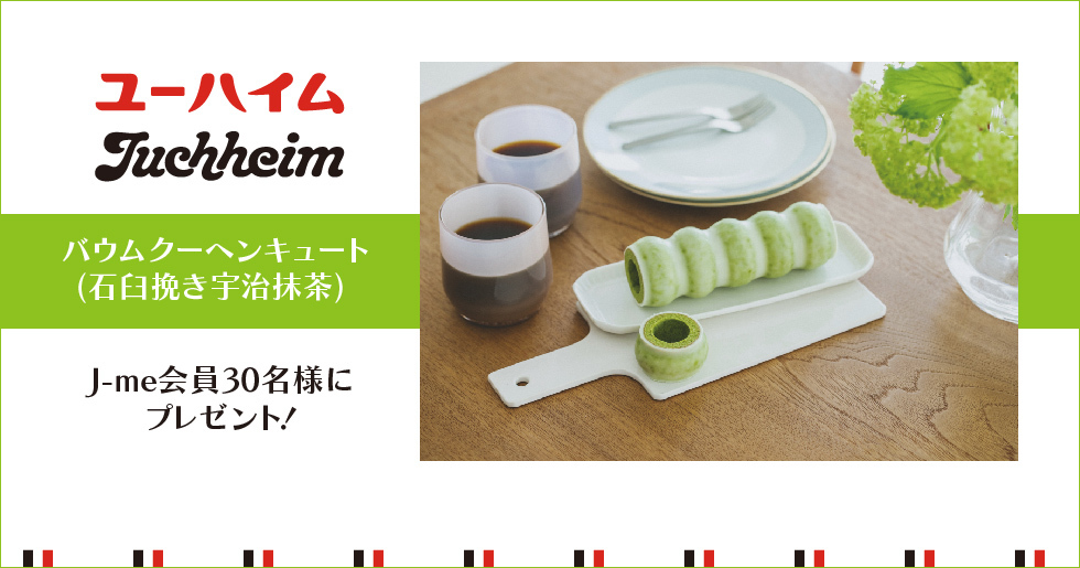 4月17日にユーハイムから発売をスタートする「バウムクーヘンキュート(石臼挽き宇治抹茶)」を特別にJ-me会員または新規ご入会の方、30名様に2個セットでプレゼント!