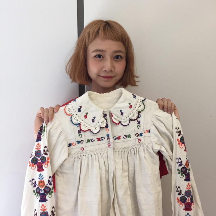 「古着が大好きなので、古着が欲しい時は古着の街・高円寺へ出かけます。原宿と比べると、高円寺はカラフルなイメージ。原宿とは違うカラフルさがあると思います。レトロで古き良きものを大事にしているイメージで、私もすごく欲しくなります。交戦時で見つけたお気に入りの洋服は、ヴィンテージのブラウスで、いつの時代のものかわからないものですが、おそらく子供サイズ。刺繍が細かくてギャザーでボリュームがあるところが気に入っています。好きなエリアは南口。好きな古着屋さんは、ダイダイ、グリーンドットなどですね。高円寺に行くと気を張らなくていいですね。ぼーっとして歩ける、落ち着ける場所です。最近純喫茶巡りが好きなので高円寺の純喫茶もこれから開拓していきたいなと思ってます。」