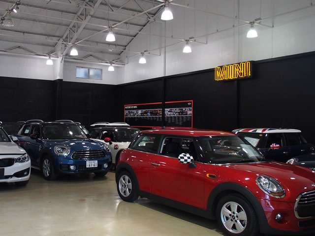 BMWの認定中古車を見ていく河口さん。さすが元倉庫というだけあり、天井も高くて非常に大きな作りになっています。奥に歩いていくと、MINI NEXT勝ちどきを発見しました。MINIがおよそ20台ほど並んでいるのを眺めて、テンションが上がる河口さんでした!