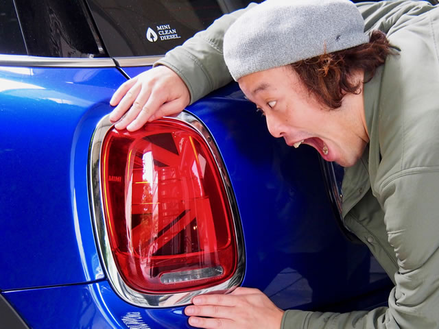 そしてついに、新型のMINI 5 DOORを発見。メタリックなボディで、テイルランプがユニオンジャックになっています。特にやついさんが気に入ったのは、テイルランプが光った瞬間。三本線が浮かび上がると、「笑ってるみたいで可愛い!」と絶賛していました。