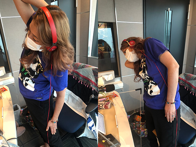 ⒊下ろした手の方のくびれを潰すように身体をゆっくり曲げる