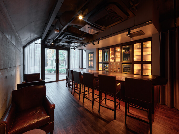 赤レンガ作りの入口から店内に入ると、バーカウンターとテーブル席、ライトアップされた棚にはライトアップされたボトルたちがずらっと並べられています。