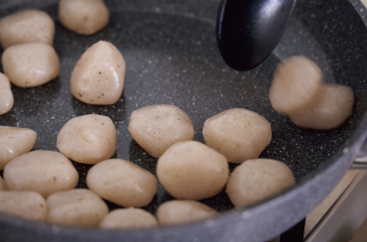★ポイント:炒めているこんにゃくから「きゅる〜ッ」と音が出たら、うどんスープを入れるサイン!