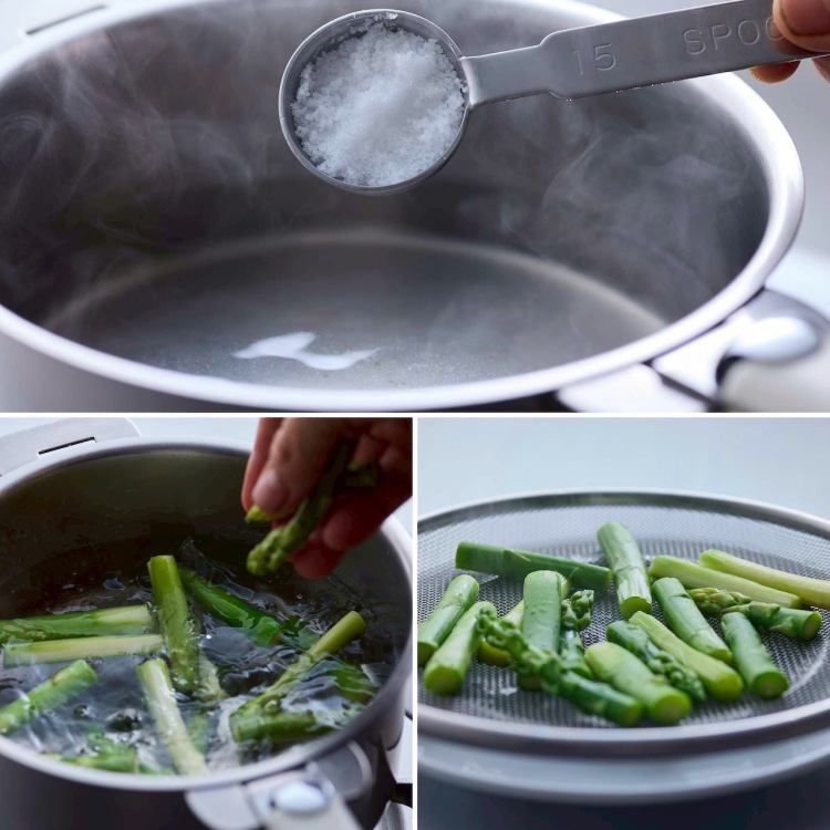 2)鍋にアスパラガスを茹でやすい量の水と1%の塩を入れて沸かす。(例えば、500mlの水に、あら塩小さじ1) しっかり沸いたらアスパラガスを入れ、さっと茹でて、おか上げにし、広げて冷ます。
