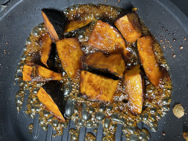 4)かぼちゃをいったん取り出し、フライパンの油をペーパータオルでふきとったら、そこに(甘辛ダレ)の材料を全て入れる。