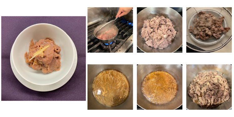 3)たっぷりの湯に牛小間切れ肉を入れて、約5秒間霜降りして(沸騰したお湯にさっと通して)ザルにあける。