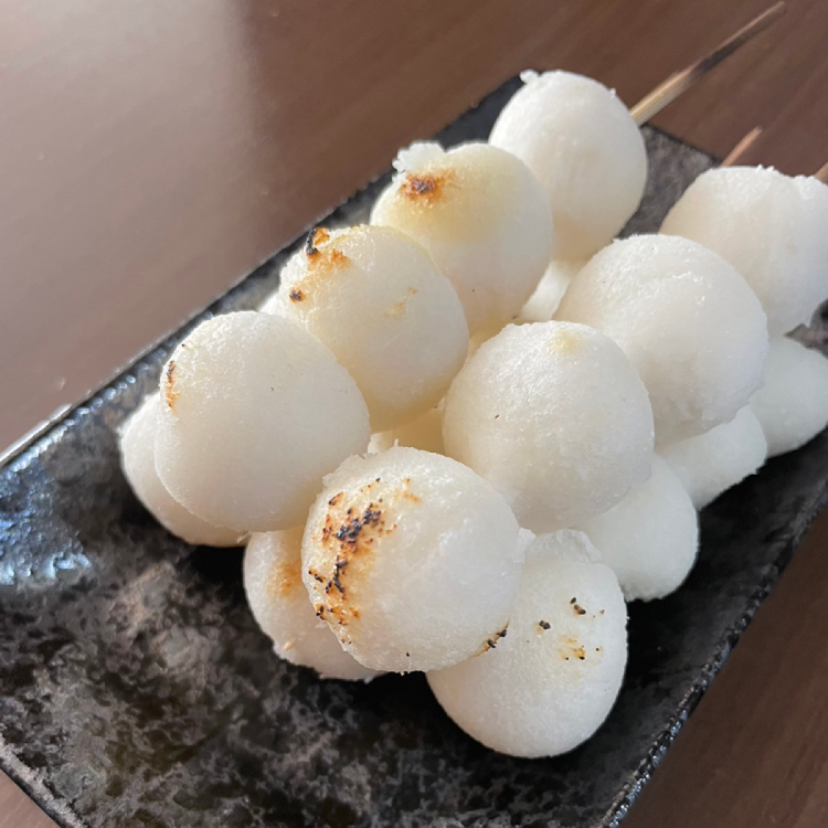 6)生地を団子状に丸めて串に刺し、網に載せて炭などで焼く。