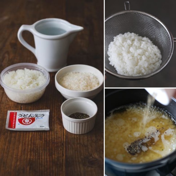 1)冷ごはんは水で洗って、ザルに上げて水気をきる。