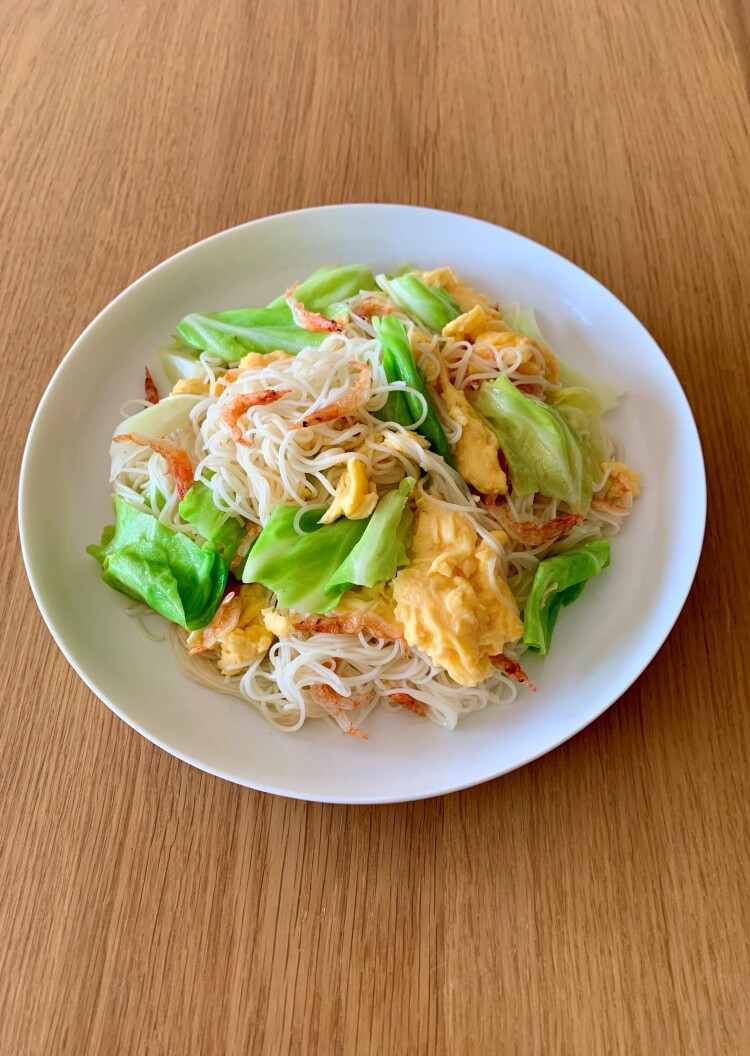 「春キャベツ、卵、桜えびの炒めそうめん」です。