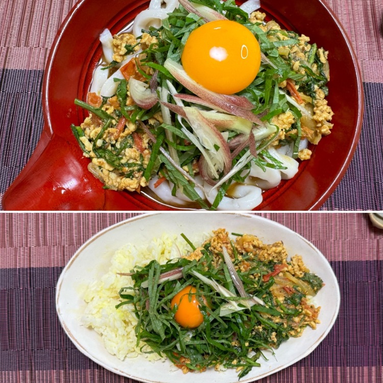5)4をうどんやご飯などにかけ、卵黄、大葉、みょうがをトッピングして完成。