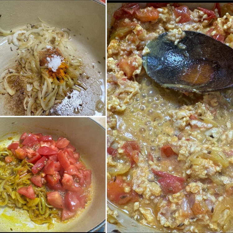2)鍋を火にかけて油を入れる。油が温まったら、クミンシードと玉ねぎを入れて炒める。玉ねぎがあめ色になってきたらAを入れて混ぜ、香りが立ち始めたらトマトを入れる。