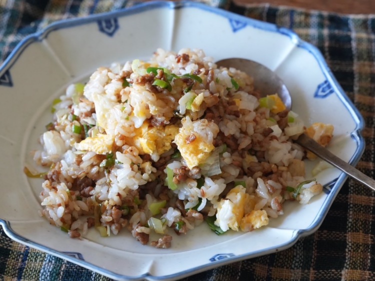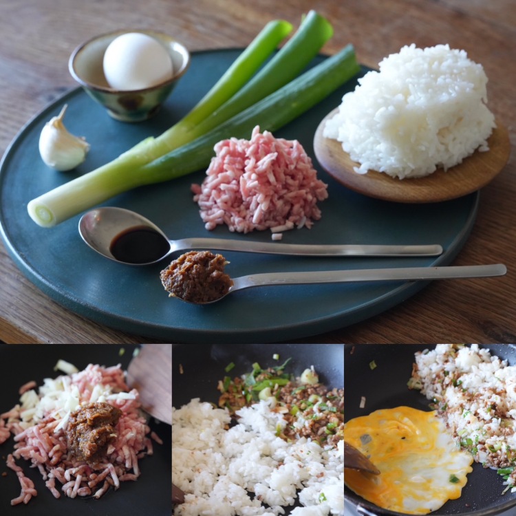 3)2の豚ひき肉に火が通ったらご飯を入れて炒め、フライパンの端に寄せる。空いた場所に溶き卵と塩ひとつまみを入れてざっとヘラで混ぜてから、端に寄せたご飯と混ぜ合わせる。仕上げに胡椒をかけて出来上がり。