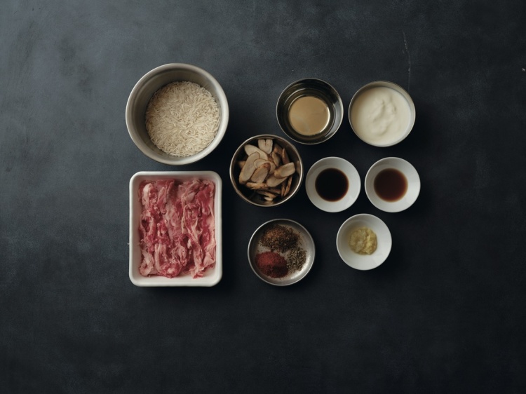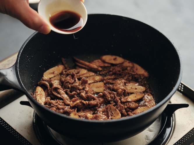 1)深型フライパンに米油、牛切り落とし肉、<スパイス>を入れ、サッと和える。中火にかけ、牛肉の色が変わるまで炒める。
