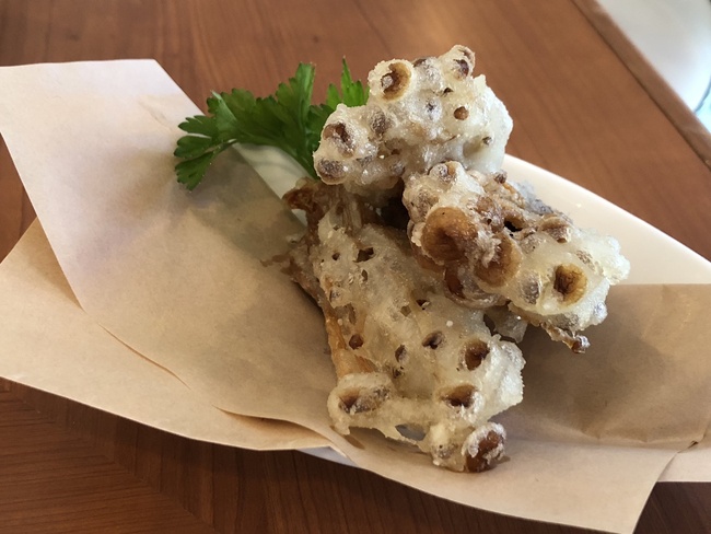 米粉と葛粉(くずこ)を使った エノキのフリット。