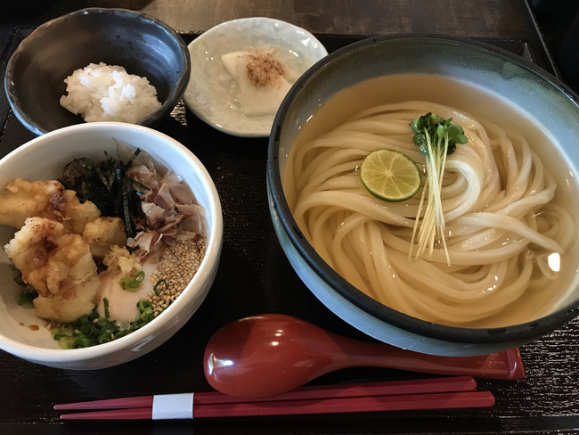 うどんを学ばれた後に、ラーメンも本格的に学んでいるんという店主の山縣さん。この塩っ気の強いつけ汁に使われる出汁醤油こそが、つけ麺ダシを応用した技術が使われているのです!温泉卵、紫蘇、すだち、いりこ揚げの香りや味が口いっぱいに広がるため、別メニューのようにスルスル頂けちゃいます。そして最後、麺のシメに一口ご飯がついてきます。一杯で3度も美味しい 讃岐うどん!