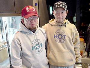 | TOKIO HOT 100特製パーカーを着る作家・オオボケ大桶と AD・ナニゴト後藤。