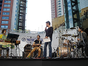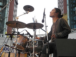 ドラムを叩く大助さんの視線の先には どこまでも広がる六本木の空が。。。 |