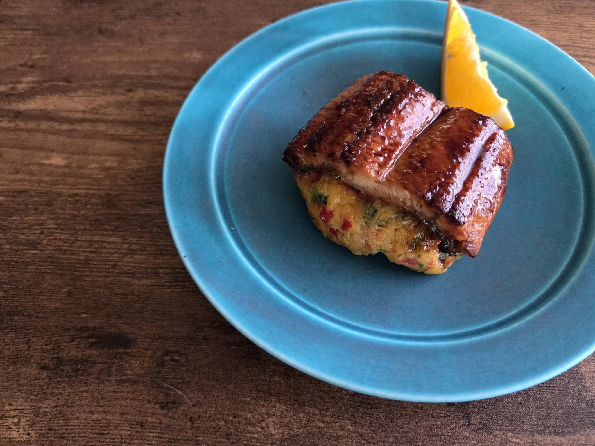 - ラップを広げて中央にうなぎのかば焼きを皮を上にして置く。2をうなぎの上にのせる。ラップで茶巾絞りにしてレンジで加熱する(600w1分30秒~2分目安)。粗熱が取れたらラップをはずし、器に盛る。好みで柑橘系を添えて完成。