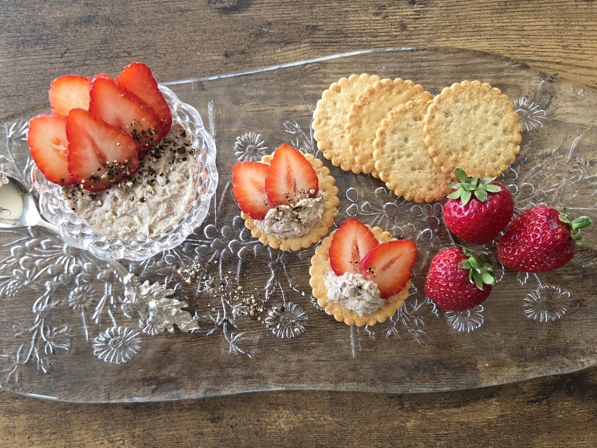 - 食べる直前に2を冷蔵庫から出して、粗挽きこしょうをかける。いちごとクラッカーを添えて完成。