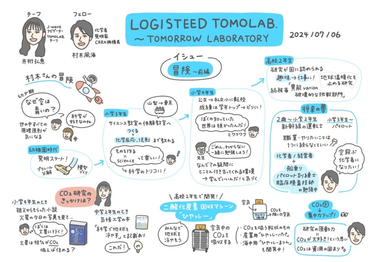 俳優・モデルとしても活躍する井桁弘恵がチーフとしてナビゲート。「明日」を明るくするヒントを探し続ける「ラボ」という名のラジオ『TOMOLAB.』毎週の研究は 絵と文字でまとめるグラフィックレコーディング<グラレコ>します。フェローに、化学者・発明家 / CRRA機構長村木風海さんをお迎えしました。幼い頃からの「なぜ?なんで?」から科学に興味を持ちCO2に魅了され、活動されている村木さんの冒険の日々についてお話ししました。火星への冒険のお話は次週へ続く・・・