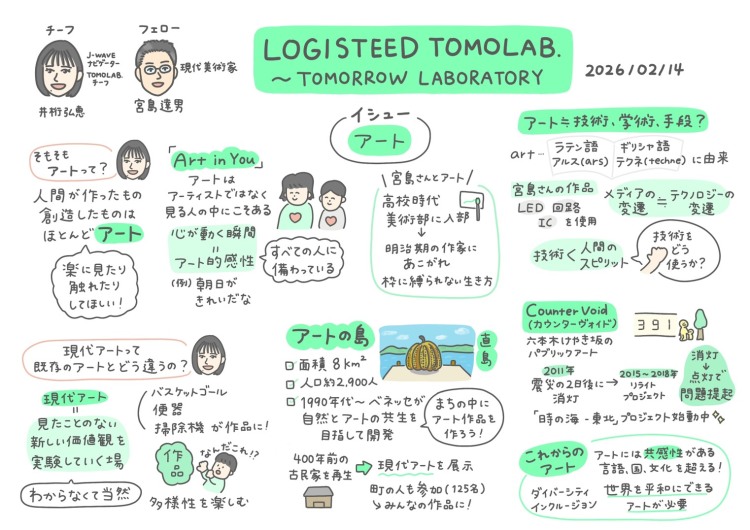 俳優・モデルとしても活躍する井桁弘恵がチーフとしてナビゲート。「明日」を明るくするヒントを探し続ける「ラボ」という名のラジオ『TOMOLAB.』毎週の研究は 絵と文字でまとめるグラフィックレコーディング<グラレコ>します。フェローとして 現代美術家の宮島達男さんをお迎えしました。